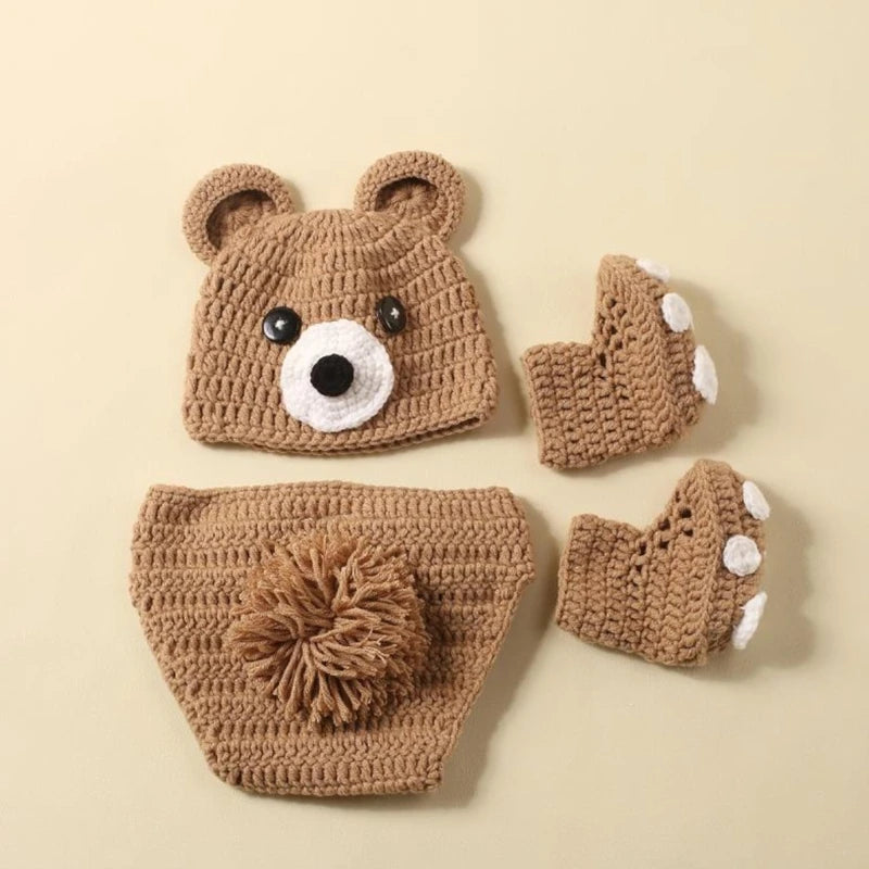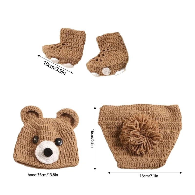 Designed for newborns aged 0-6 months, this charming hat, pants, and matching socks set features an endearing cartoon bear design crafted from soft, breathable knitting wool. With precise measurements—hat circumference approximately 35cm, pants 18x16cm, and socks 10cm long—this outfit ensures a comfortable and warm fit. Perfect for newborn photography, family gatherings, or special occasions, this elegant ensemble adds a timeless touch to your baby’s earliest memories. Please note slight variations in color and measurement may occur due to display and manual sizing.