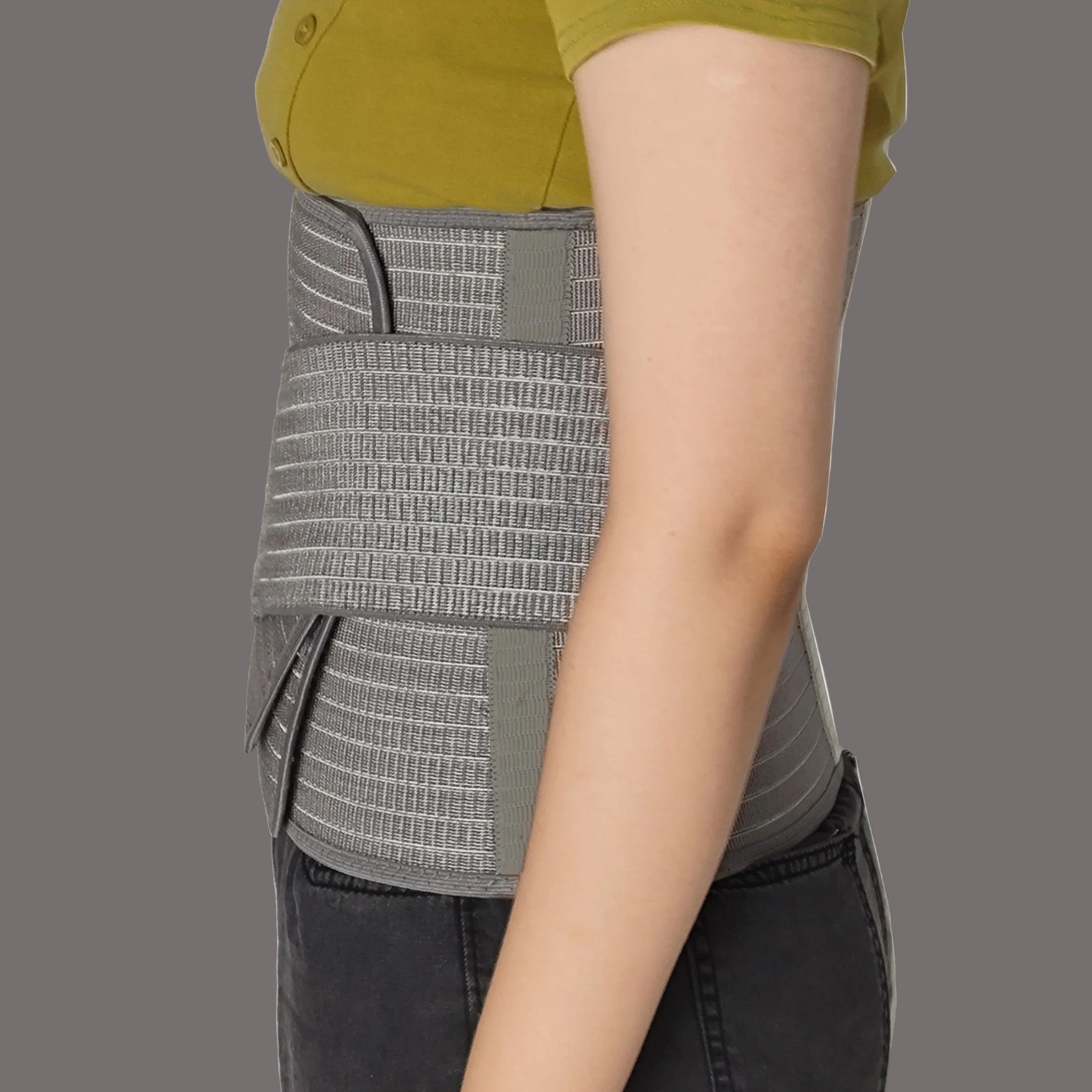• Crosses two stretchable Velcro belts above uterus for extra compression