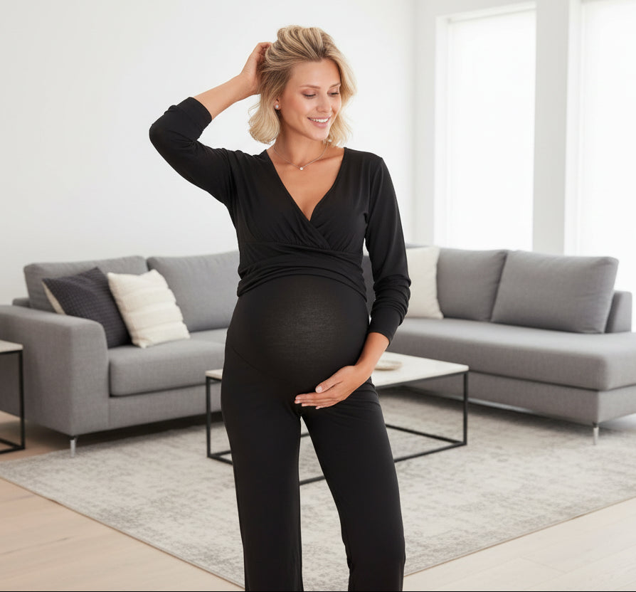 Crafted from a premium blend of 95% viscose and 5% elastane, these pajamas deliver exceptional softness and gentle stretch through every stage of motherhood. The thoughtfully designed nursing-friendly neckline provides discreet, easy access when you need it most—whether during pregnancy, active nursing, or beyond. Designed to move with your body as it changes, they offer the comfort and functionality that modern mothers demand.
