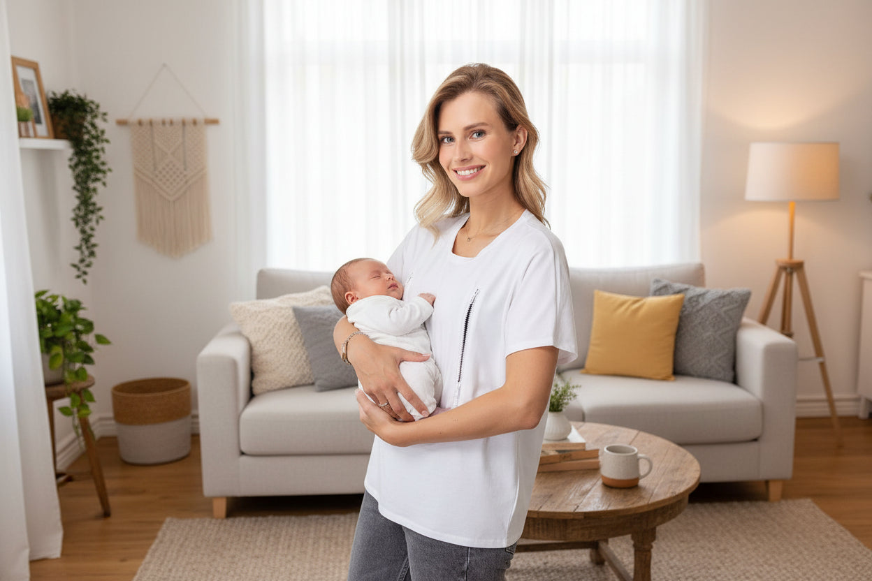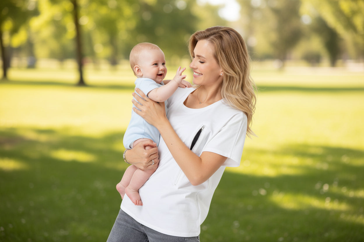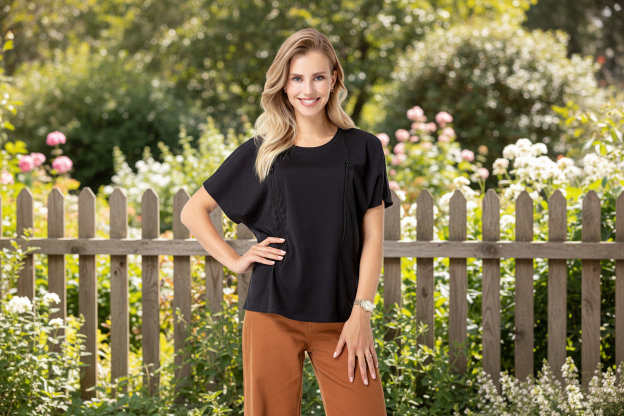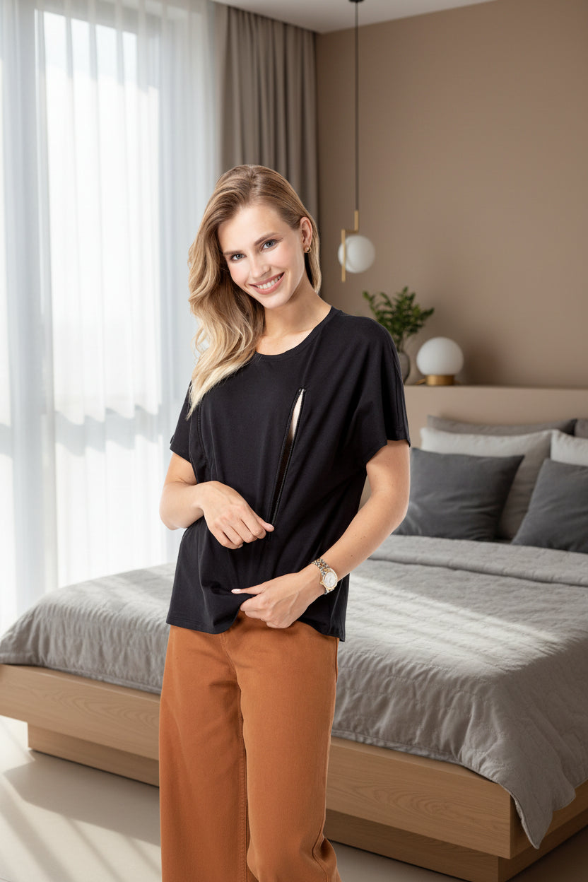 Crafted from pure cotton, this oversized tee transitions seamlessly from pregnancy through nursing and beyond. Discreet chest zippers enable quick, effortless nursing access—no complicated maneuvers required. The relaxed fit accommodates your changing body during pregnancy while maintaining a polished silhouette postpartum, making it a versatile staple for every stage of motherhood.
