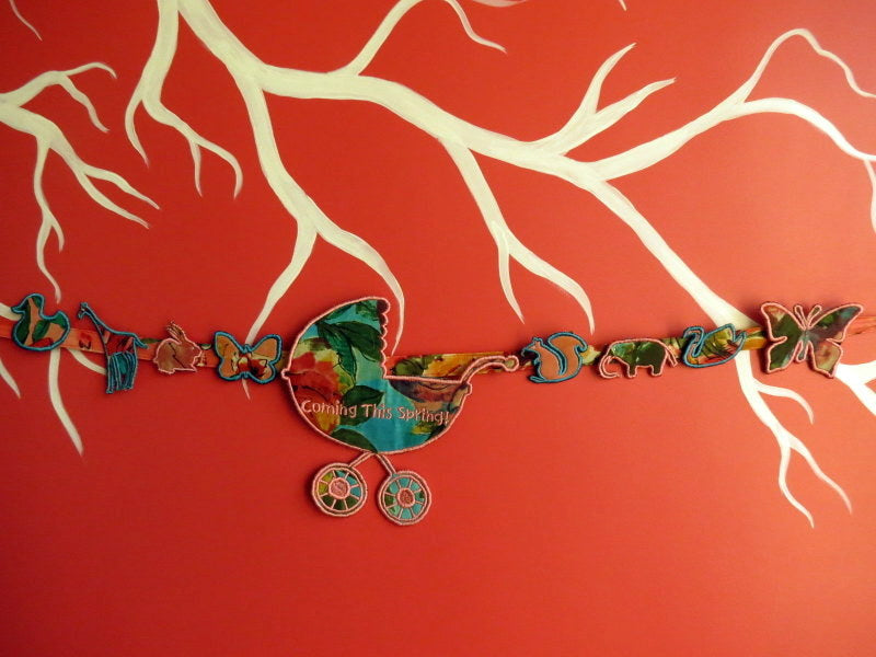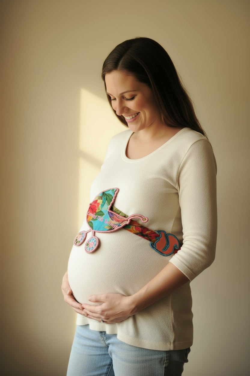 This handcrafted maternity sash celebrates your pregnancy journey with customizable woodland animal and carriage emblems. Each design element is meticulously embroidered and backed with canvas and foam batting for a polished, heirloom-quality finish. The removable emblems—secured with loops—let you personalize with your baby's name, due date, gender reveal, or any meaningful phrase. Available in multiple fabric colors with pink embroidery detailing. After baby arrives, repurpose the emblems as lasting nursery décor. One-size-fits-all. Custom designs for other occasions welcome upon request.
