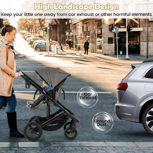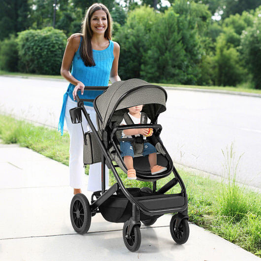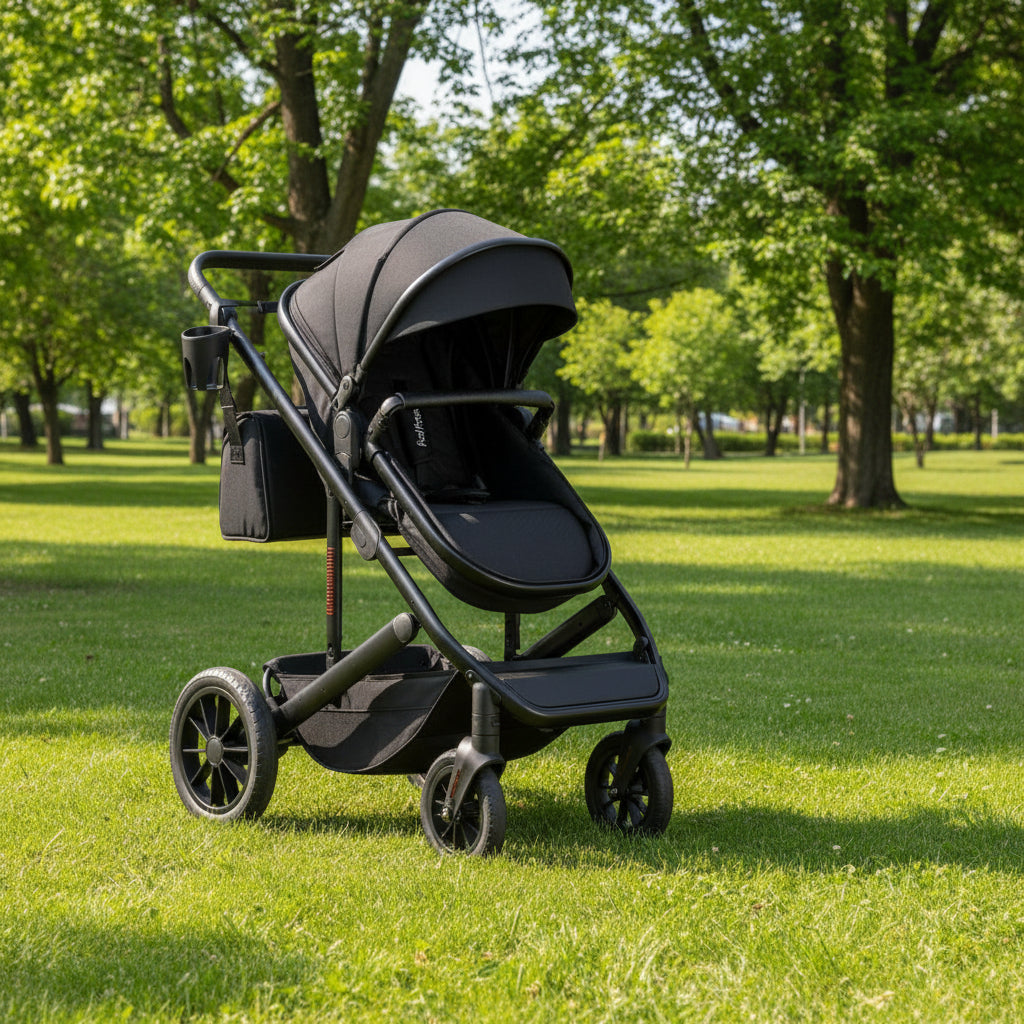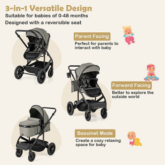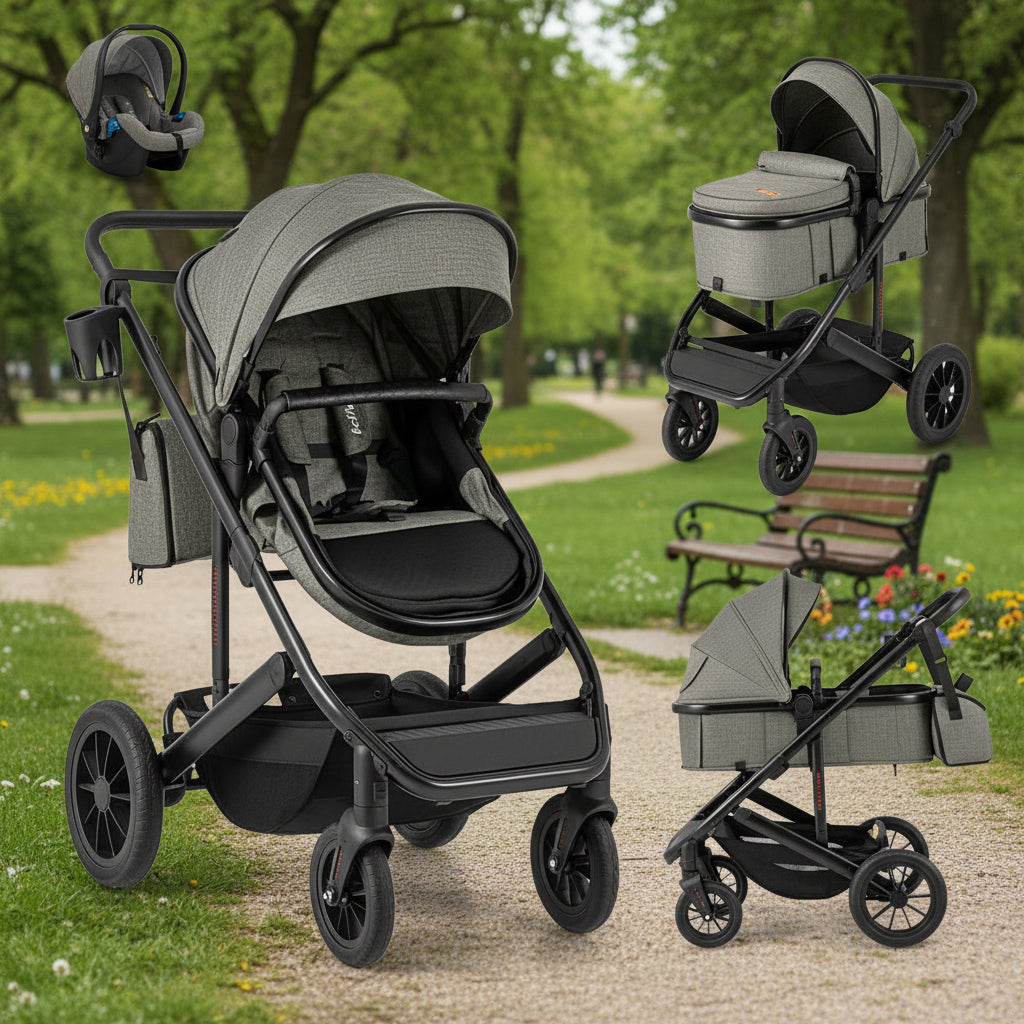 This premium 3-in-1 stroller seamlessly transitions from bassinet to carriage to pushchair, accommodating newborns through toddlers with versatile comfort. The reversible seating lets you choose parent-facing or forward-facing orientation, while the detachable bassinet with three angle positions cradles infants in style. Engineered with a lightweight yet robust aluminum frame, shock-absorbing wheel suspension, and a nine-position adjustable handle, it adapts to parents of varying heights. The four-level canopy provides customizable coverage, while the one-step rear brake and five-point harness ensure reliable safety. Practical touches include a spacious storage basket, included diaper bag, cupholder, and detachable footmuff for year-round use. Lockable universal wheels offer controlled maneuverability on any terrain. Fully compliant with ASTM and CPSIA standards, this stroller delivers both elegance and dependable protection for your growing family.