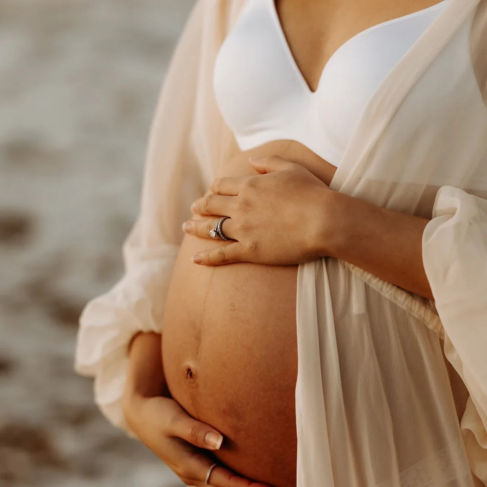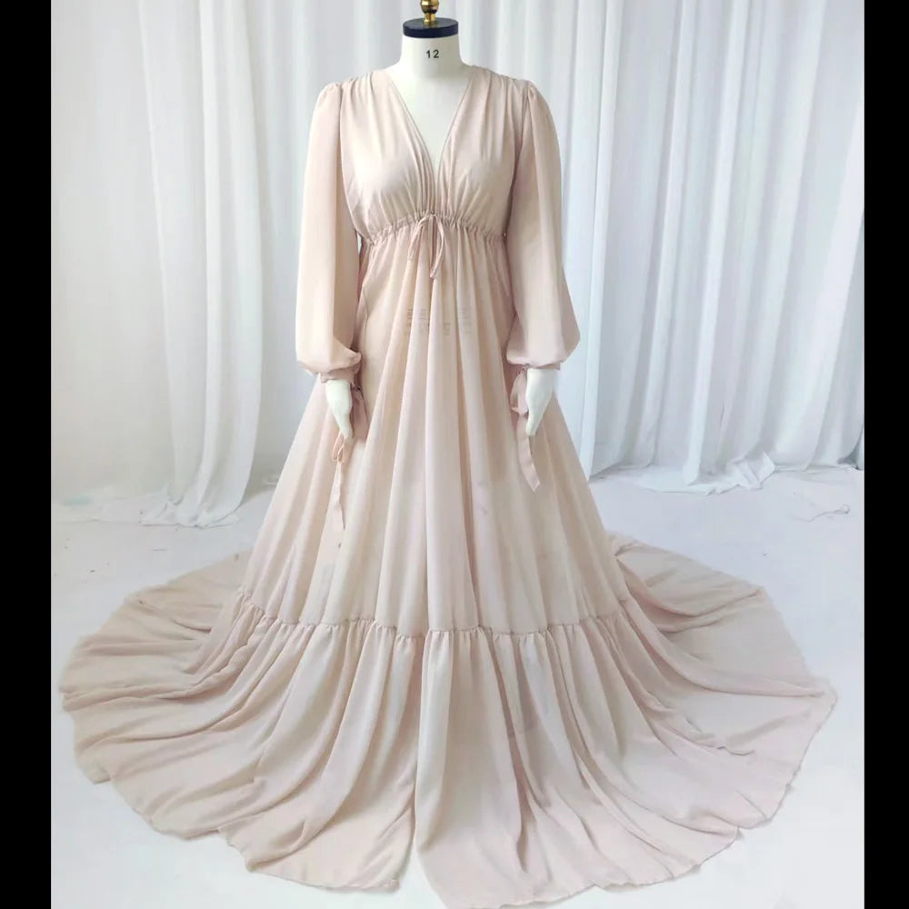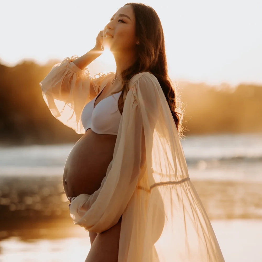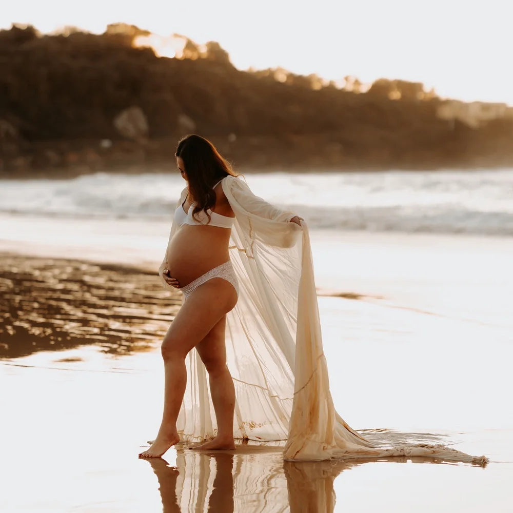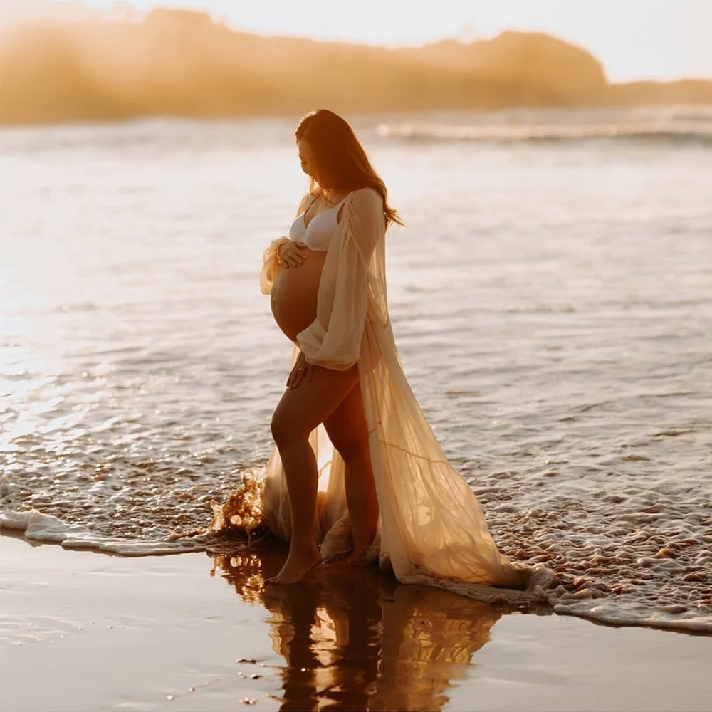 This luxurious maternity gown is crafted from delicate, transparent chiffon that drapes beautifully for a refined and sensual look. Ideal for beach or studio photo shoots, it highlights your natural glow while offering a lightweight, breathable fit. Perfect as a prop or standalone piece, it brings an elegant, sophisticated touch to your maternity photography.