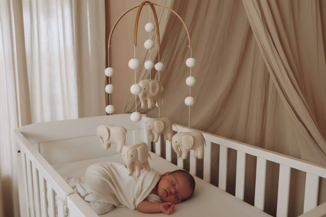 This handmade wooden mobile features whimsical elephant and whale figures suspended beneath a moonlit scene, creating a serene focal point for any nursery. Crafted from sustainably sourced wood, each mobile is individually constructed to ensure one-of-a-kind character. The slow, deliberate rotation engages your baby's visual development while the calming composition supports restful sleep patterns. The natural warmth of wood complements modern and traditional nursery aesthetics alike. Pairs seamlessly with a music box for enhanced bedtime routines. An heirloom-quality piece that transforms a simple bedroom into a sanctuary of wonder and comfort.