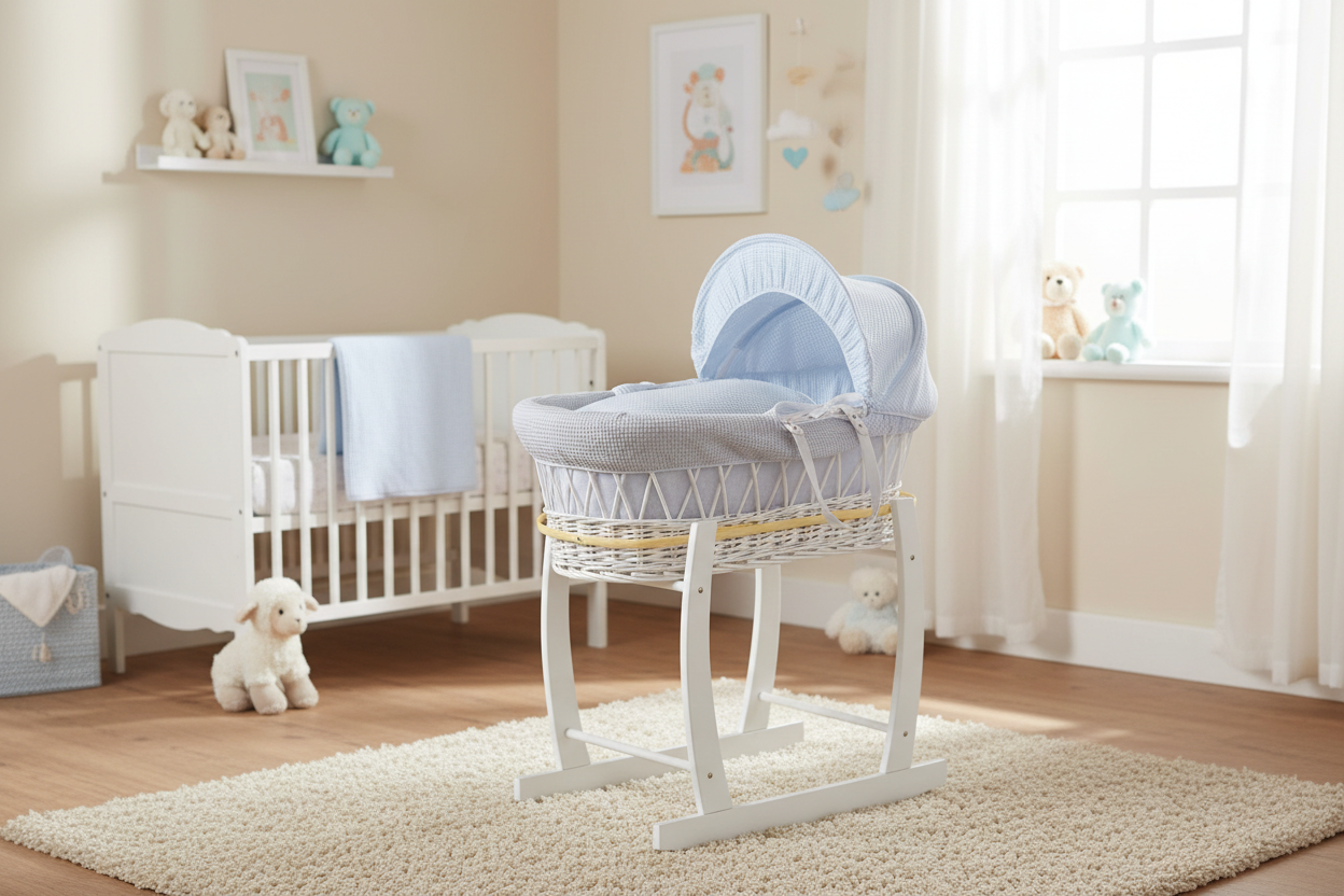 Introduce your infant to restful sleep with this hand-woven Pink Dimple White Wicker Baby Moses Basket. The soft pink dimpled fabric and classic white wicker design create a calming aesthetic that complements any nursery. Engineered for safety and comfort, it features a hypo-allergenic mattress with Space-Tec padding and exceeds EU standard EN 1466:2014+AC:2015. The included rocking stand enables gentle swaying to soothe your baby into sleep. Machine-washable fabrics simplify maintenance, while the portable design allows seamless transitions between rooms. Dimensions: basket 83cm L × 49cm W; mattress 66cm × 29cm. A thoughtfully constructed investment in your baby's sleep quality and security.