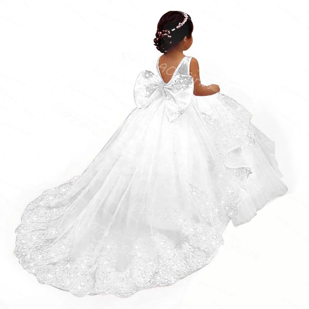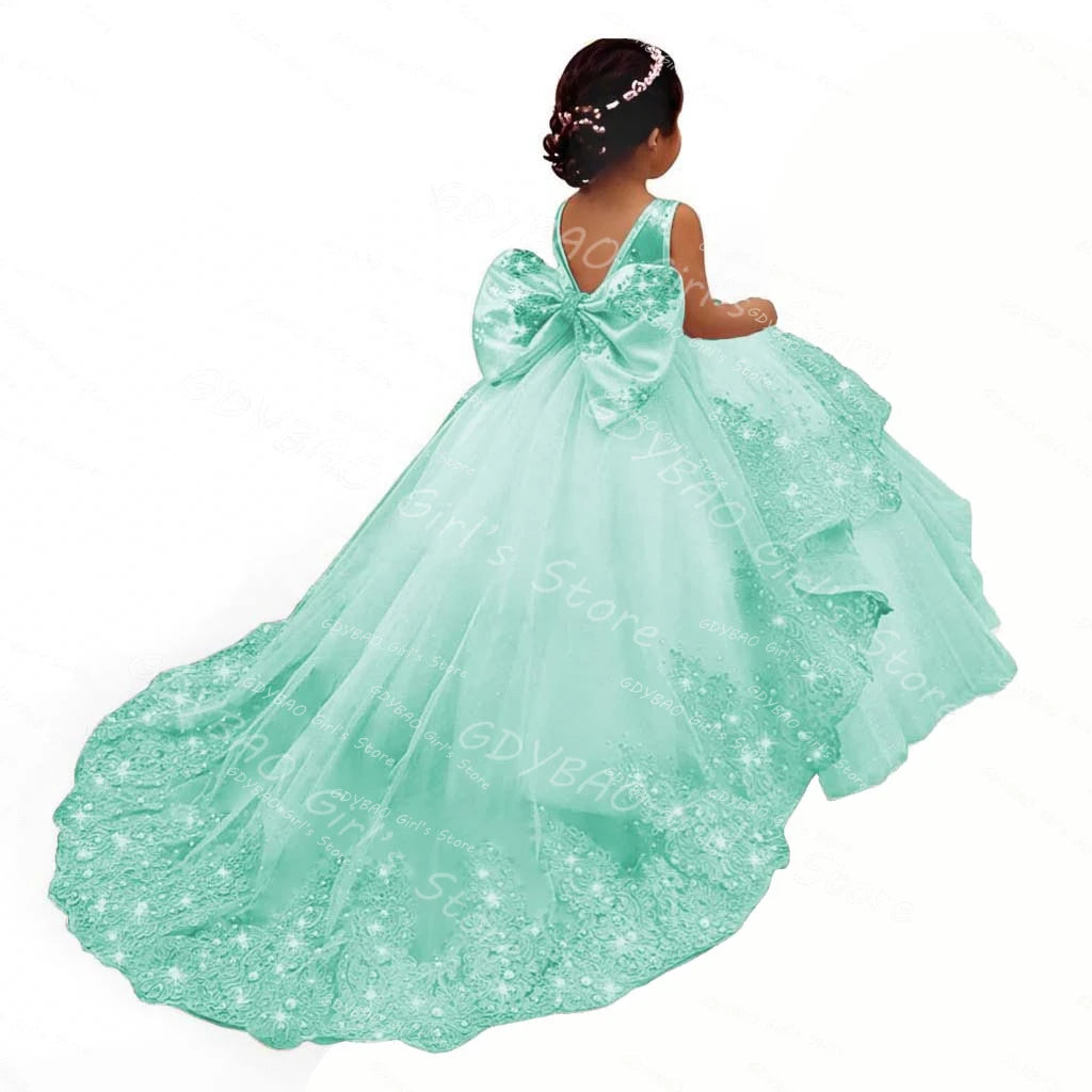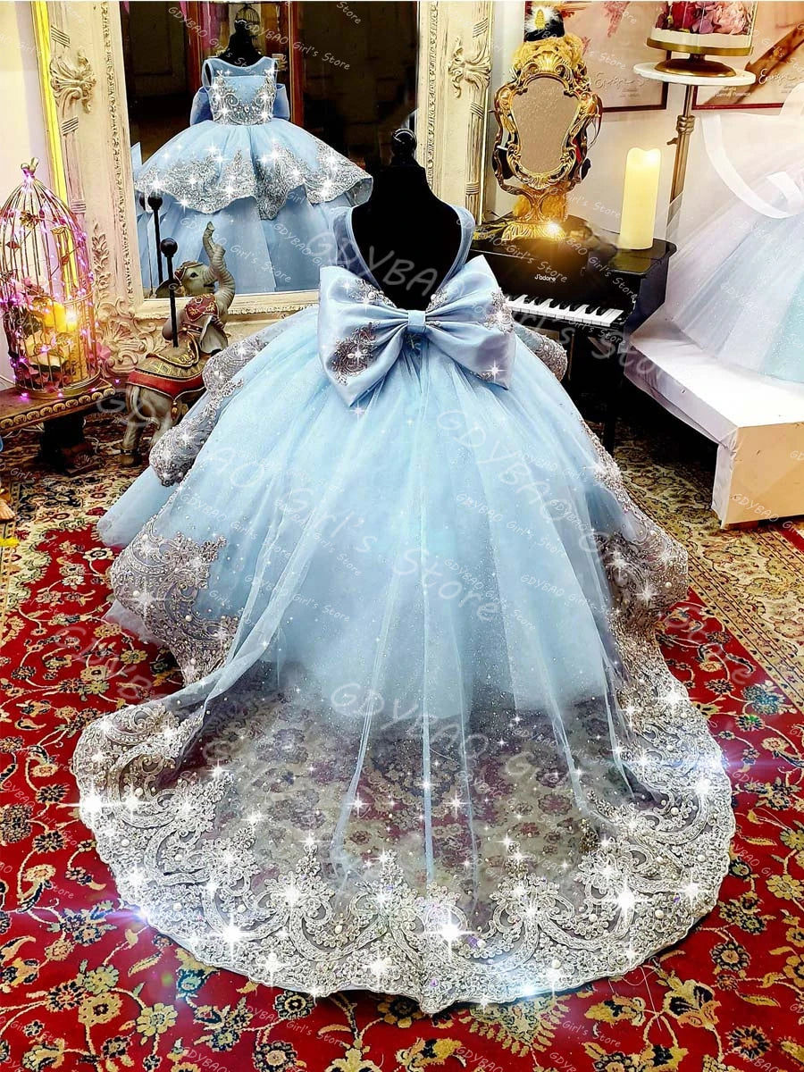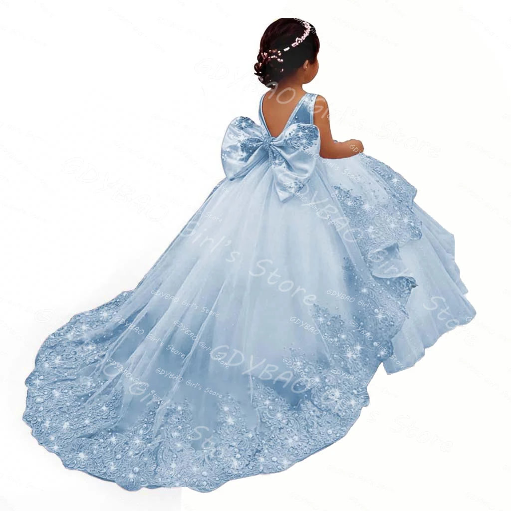 Sky Blue Princess Pageant Dress With Train 2025 Birthday Gown Kids Beaded Lace Flower Girl Dress Customized Wedding Party Frock