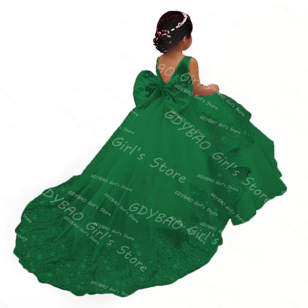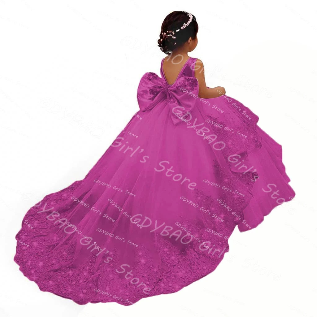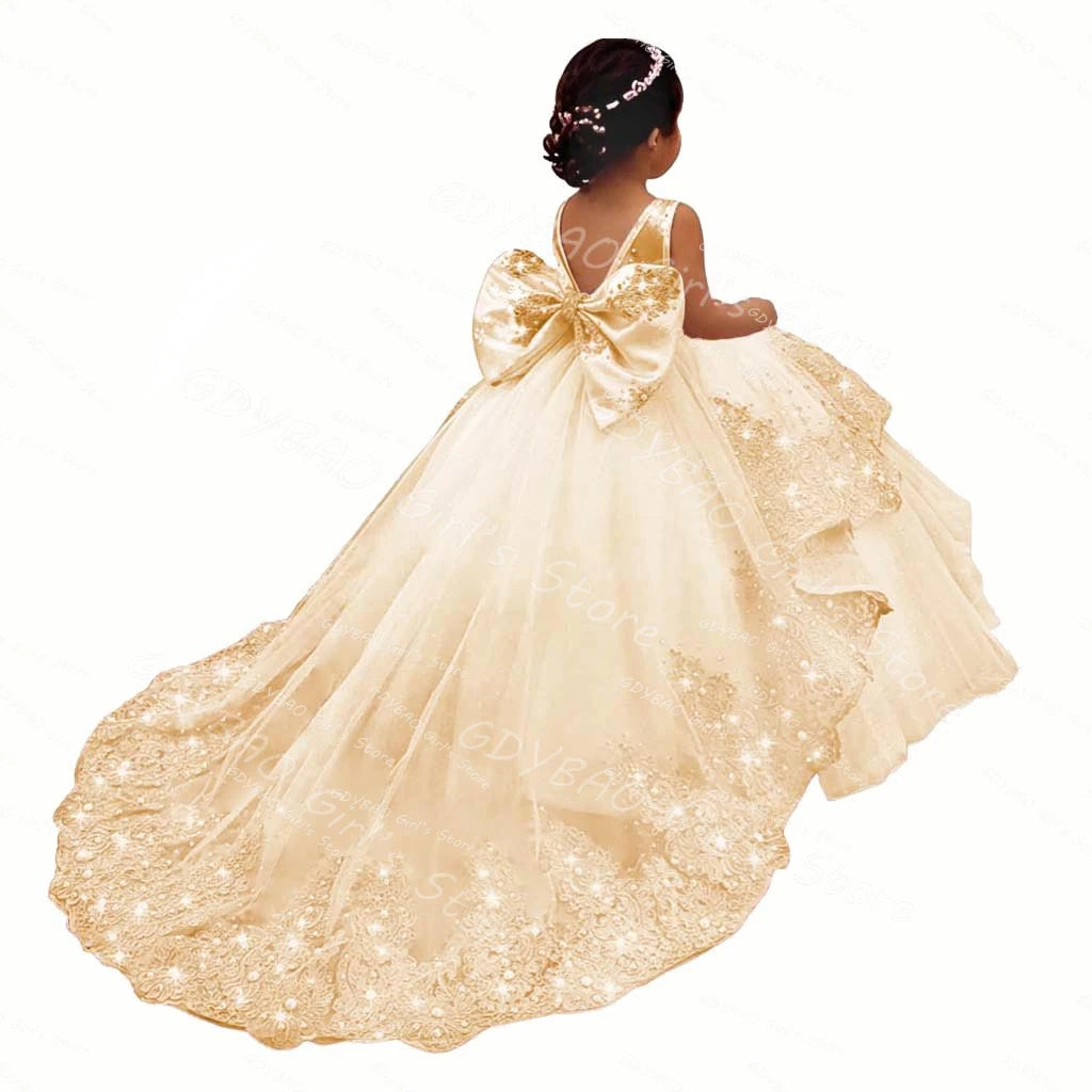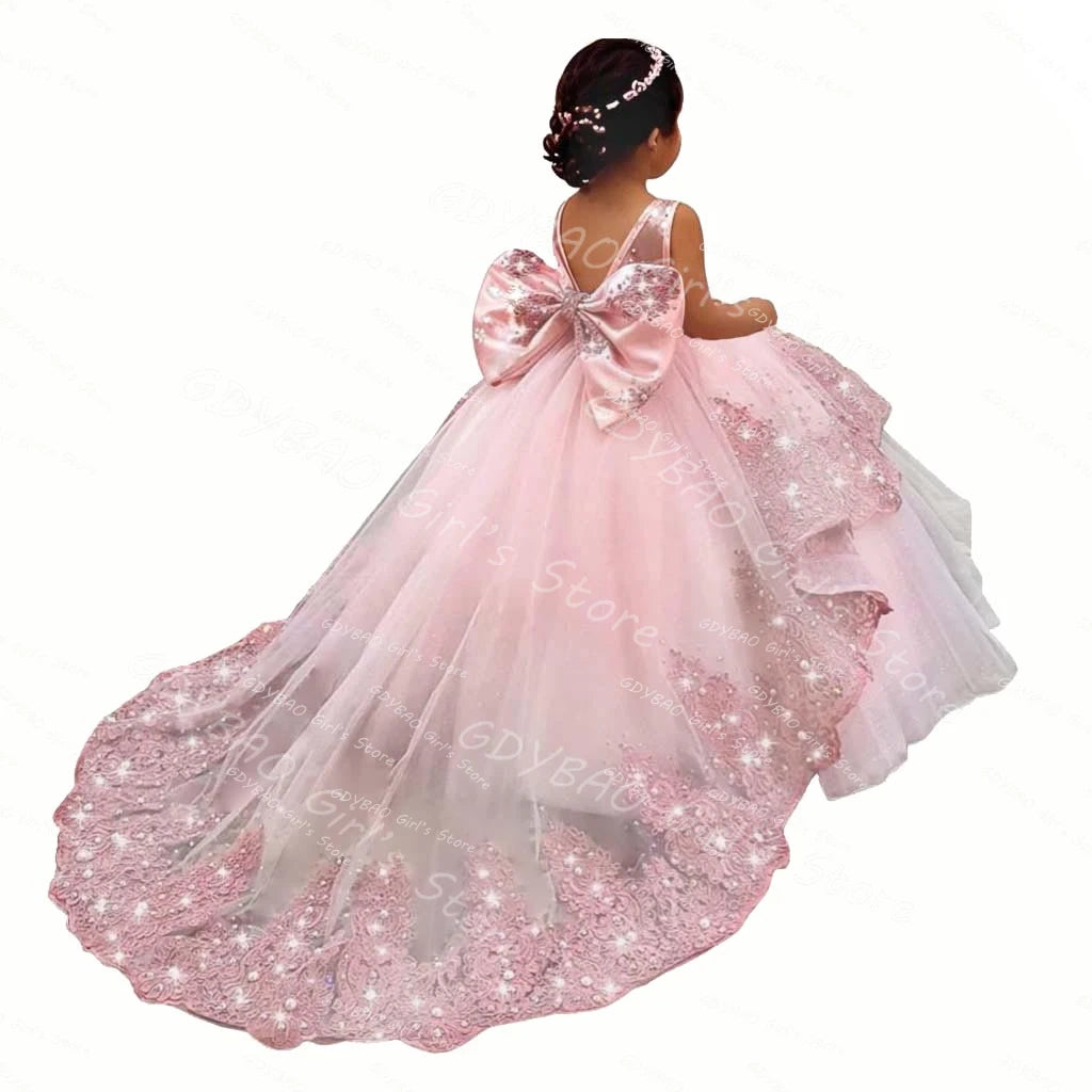 Sky Blue Princess Pageant Dress With Train 2025 Birthday Gown Kids Beaded Lace Flower Girl Dress Customized Wedding Party Frock